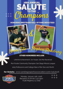 Salute to the Champions is San Diego’s premiere sports awards gala, where the year’s memorable performances are celebrated and all-time greats receive the community’s highest sports honor: Induction into the Breitbard Hall of Fame. Pro and Amateur Stars of the Year for 2025 will be recognized, as will the individuals who have made significant contributions to the San Diego sports landscape.